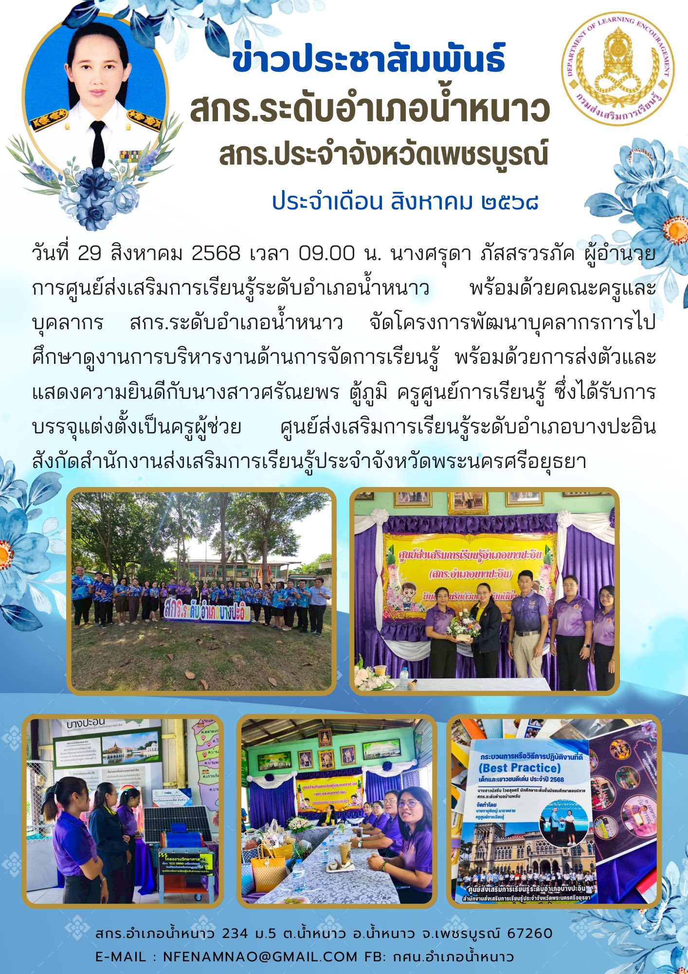 วันที่ 29 สิงหาคม 2568 เวลา 09.00 น. นางศรุดา ภัสสรวรภัค ผู้อำนวยการศูนย์ส่งเสริมการเรียนรู้ระดับอำเภอน้ำหนาว พร้อมด้วยคณะครูและบุคลากร สกร.ระดับอำเภอน้ำหนาว จัดโครงการพัฒนาบุคลากรการไปศึกษาดูงานการบริหารงานด้านการจัดการเรียนรู้  ศูนย์ส่งเสริมการเรียนรู้ระดับอำเภอบางปะอิน สังกัดสำนักงานส่งเสริมการเรียนรู้ประจำจังหวัดพระนครศรีอยุธยา