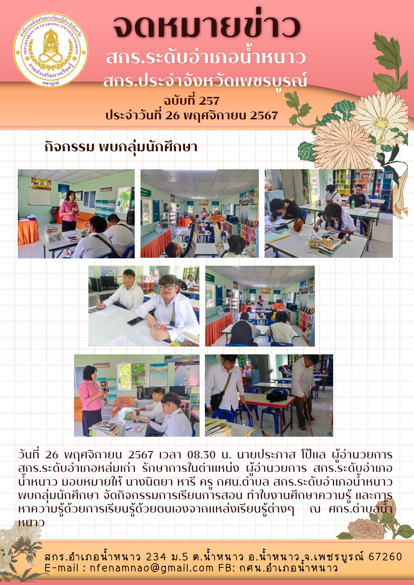 นที่ 26 พฤศจิกายน 2567 เวลา 08.30 น. นายประภาส โป้แล ผู้อำนวยการ สกร.ระดับอำเภอหล่มเก่า รักษาการในตำแหน่ง ผู้อำนวยการ สกร.ระดับอำเภอน้ำหนาว มอบหมายให้ นางนิตยา หารี ครู กศน.ตำบล สกร.ระดับอำเภอน้ำหนาว พบกลุ่มนักศึกษา จัดกิจกรรมการเรียนการสอน ทำใบงานศึกษาความรู้ และการหาความรู้ด้วยการเรียนรู้ด้วยตนเองจากแหล่งเรียนรู้ต่างๆ ณ ศกร.ตำบลน้ำหนาว