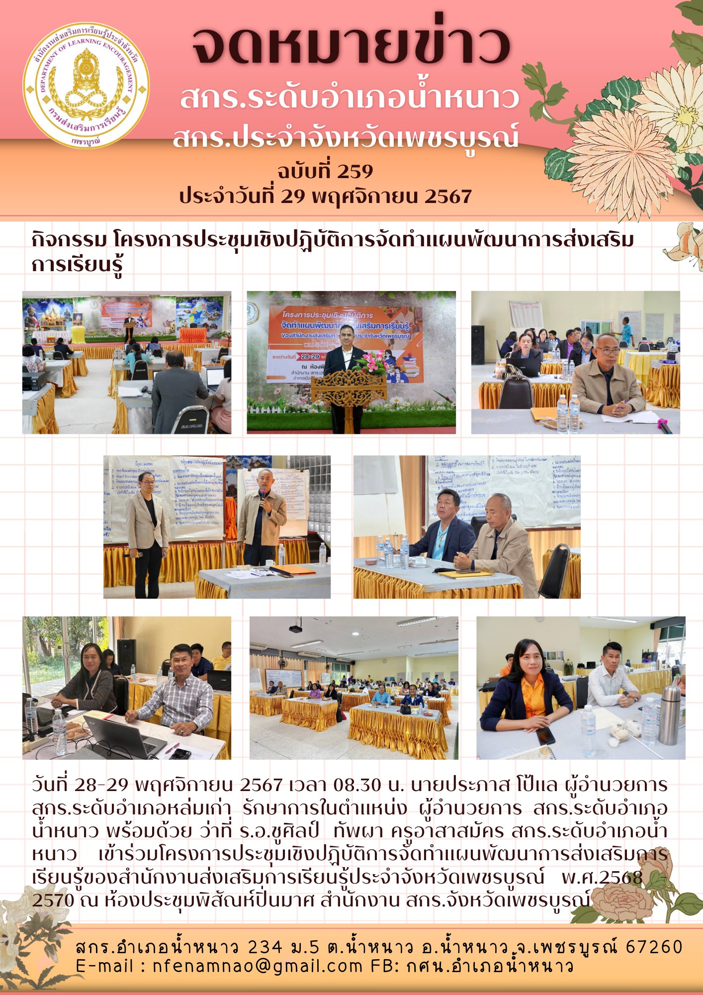 วันที่ 28-29 พฤศจิกายน 2567 เวลา 08.30 น. นายประภาส โป้แล ผู้อำนวยการ สกร.ระดับอำเภอหล่มเก่า รักษาการในตำแหน่ง ผู้อำนวยการ สกร.ระดับอำเภอน้ำหนาว พร้อมด้วย ว่าที่ ร.อ.ชูศิิลป์ ทัพผา ครูอาสาสมัคร สกร.ระดับอำเภอน้ำหนาว เข้าร่วมโครงการประชุมเชิงปฏิบัติการจัดทำแผนพัฒนาการส่งเสริมการเรียนรู้ของสำนักงานส่งเสริมการเรียนรู้ประจำจังหวัดเพชรบูรณ์ พ.ศ.2568 - 2570 ณ ห้องประชุมพิสัณห์ปิ่นมาศ สำนักงาน สกร.จังหวัดเพชรบูรณ์