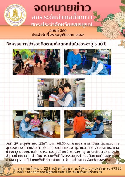 วันที่ 29 พฤศจิกายน 2567 เวลา 08.30 น. นายประภาส โป้แล ผู้อำนวยการ สกร.ระดับอำเภอหล่มเก่า รักษาการในตำแหน่ง ผู้อำนวยการ สกร.ระดับอำเภอน้ำหนาว มอบหมายให้ นางสาวนุศาลักษณ์ ซาหลง ครู กศน.ตำบล สกร.ระดับอำเภอน้ำหนาว ดำเนินการออกพื้นที่กิจกรรมการสำรวจติดตามเด็กตกหล่นในช่วงอายุ 3-18 ปี ในเขตพื้นที่ตำบลโคกมน อำเภอน้ำหนาว จังหวัดเพชรบูรณ์