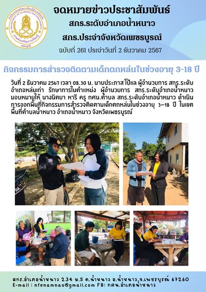 วันที่ 2 ธันวาคม 2567 เวลา 08.30 น. นายประภาส โป้แล ผู้อำนวยการ สกร.ระดับอำเภอหล่มเก่า รักษาการในตำแหน่ง ผู้อำนวยการ สกร.ระดับอำเภอน้ำหนาว มอบหมายให้ นางนิตยา หารี ครู กศน.ตำบล สกร.ระดับอำเภอน้ำหนาว ดำเนินการออกพื้นที่กิจกรรมการสำรวจติดตามเด็กตกหล่นในช่วงอายุ 3-18 ปี ในเขตพื้นที่ตำบลน้ำหนาว อำเภอน้ำหนาว จังหวัดเพชรบูรณ์