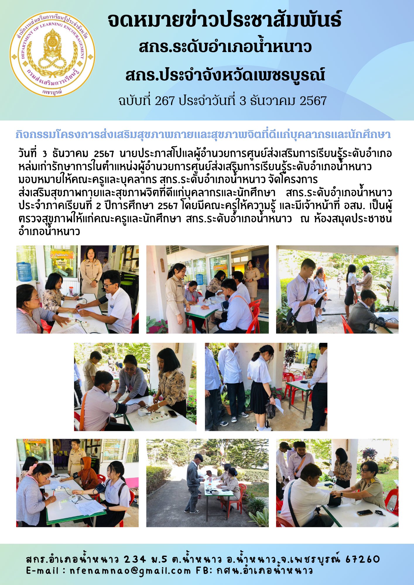 ส่งเสริมสุขภาพกายและสุขภาพจิตที่ดีแก่บุคลากรและนักศึกษา สกร.ระดับอำเภอน้ำหนาว ประจำภาคเรียนที่ 2 ปีการศึกษา 2567 โดยมีคณะครูให้ความรู้ และมีเจ้าหน้าที่ อสม. เป็นผู้ตรวจสุขภาพให้แก่คณะครูและนักศึกษา สกร.ระดับอำเภอน้ำหนาว ณ ห้องสมุดประชาชนอำเภอน้ำหนาว