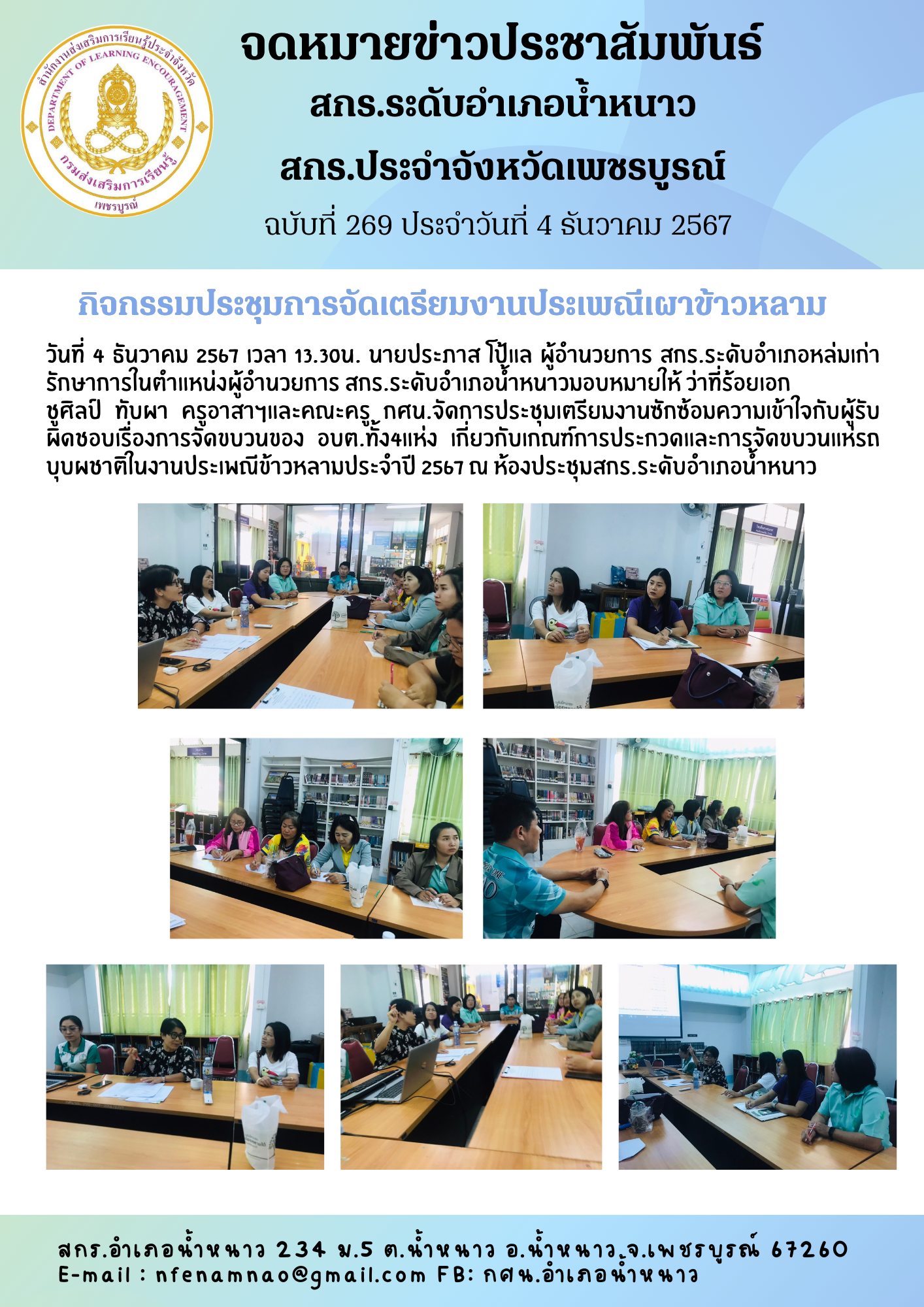 วันที่ 4 ธันวาคม 2567 เวลา 13.30น. นายประภาส โป้แล ผู้อำนวยการ สกร.ระดับอำเภอหล่มเก่ารักษาการในตำแหน่งผู้อำนวยการ สกร.ระดับอำเภอน้ำหนาวมอบหมายให้ ว่าที่ร้อยเอกชูศิลป์ ทับผา ครูอาสาฯและคณะครู กศน.จัดการประชุมเตรียมงานซักซ้อมความเข้าใจกับผู้รับผิดชอบเรื่องการจัดขบวนของ อบต.ทั้ง4แห่ง เกี่ยวกับเกณฑ์การประกวดและการจัดขบวนแห่รถบุบผชาติในงานประเพณีข้าวหลามประจำปี 2567 ณ ห้องประชุมสกร.ระดับอำเภอน้ำหนาว