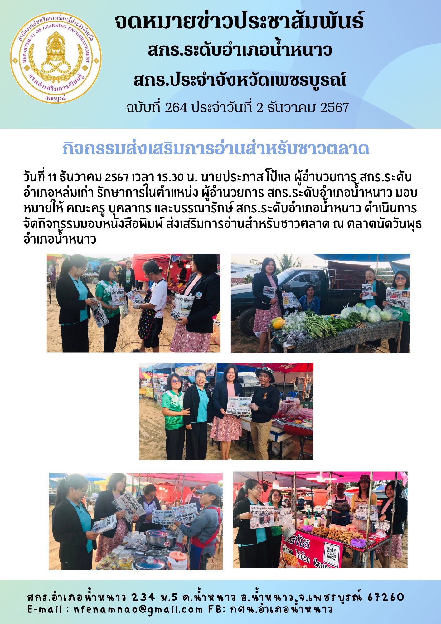 วันที่ 11 ธันวาคม 2567 เวลา 15.30 น. นายประภาส โป้แล ผู้อำนวยการ สกร.ระดับอำเภอหล่มเก่า รักษาการในตำแหน่ง ผู้อำนวยการ สกร.ระดับอำเภอน้ำหนาว มอบหมายให้ คณะครู บุคลากร และบรรณารักษ์ สกร.ระดับอำเภอน้ำหนาว ดำเนินการจัดกิจกรรมมอบหนังสือพิมพ์ ส่งเสริมการอ่านสำหรับชาวตลาด ณ ตลาดนัดวันพุธอำเภอน้ำหนาว