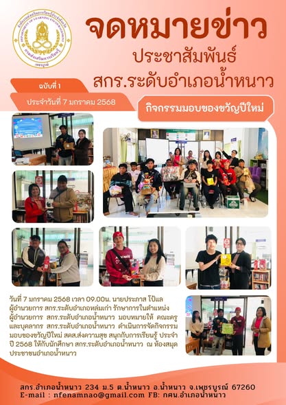 ผู้อำนวยการ สกร.ระดับอำเภอน้ำหนาว มอบหมายให้ คณะครูและบุคลากร สกร.ระดับอำเภอน้ำหนาว ดำเนินการจัดกิจกรรมมอบของขวัญปีใหม่ สคส.ส่งความสุข สนุกกับการเรียนรู้ ประจำปี 2568 ให้กับนักศึกษา สกร.ระดับอำเภอน้ำหนาว ณ ห้องสมุดประชาชนอำเภอน้ำหนาว