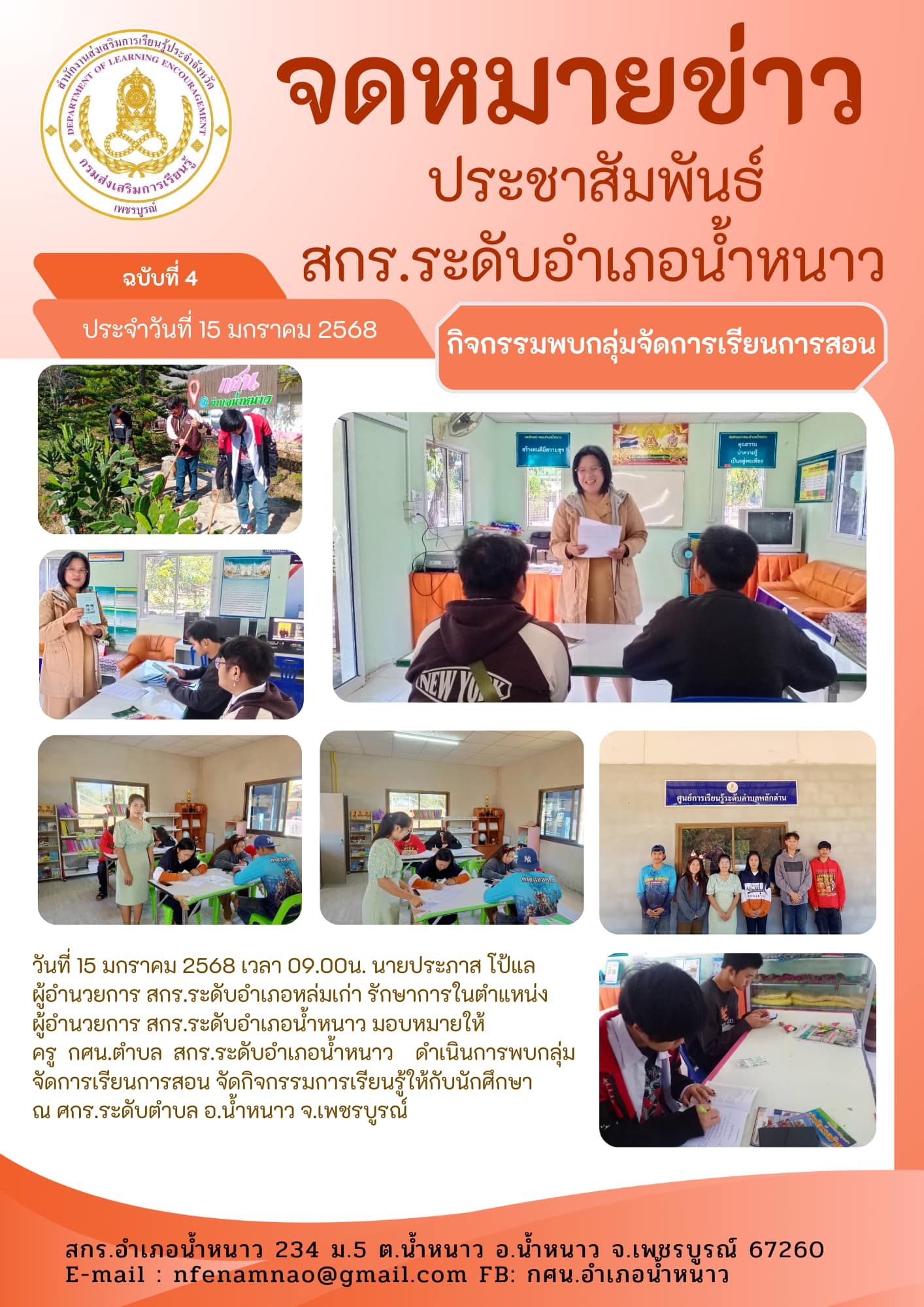 ผู้อำนวยการ สกร.ระดับอำเภอน้ำหนาว มอบหมายให้ ครู กศน.ตำบล สกร.ระดับอำเภอน้ำหนาว ดำเนินการพบกลุ่มจัดการเรียนการสอน จัดกิจกรรมการเรียนรู้ให้กับนักศึกษาณ ศกร.ระดับตำบล อ.น้ำหนาว จ.เพชรบูรณ์