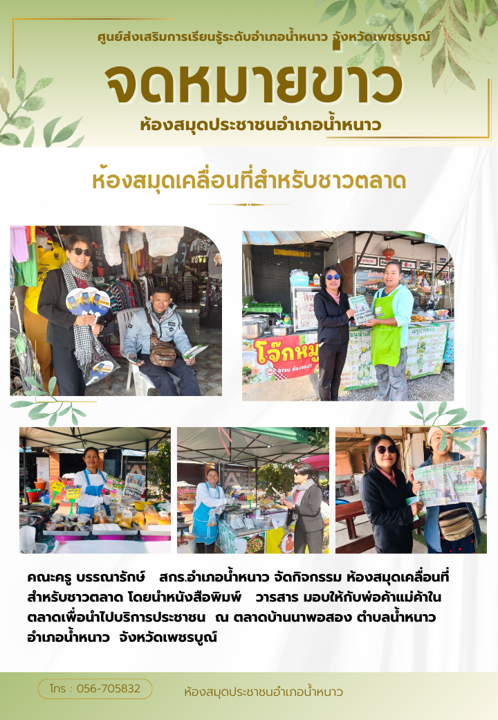 คณะครู บรรณารักษ์ สกร.อำเภอน้ำหนาว จัดกิจกรรม ห้องสมุดเคลื่อนที่สำหรับชาวตลาด โดยนำหนังสือพิมพ์ วารสาร มอบให้กับพ่อค้าแม่ค้าในตลาดเพื่อนำไปบริการประชาชน ณ ตลาดบ้านนาพอสอง ตำบลน้ำหนาว อำเภอน้ำหนาว จังหวัดเพชรบูณ์
