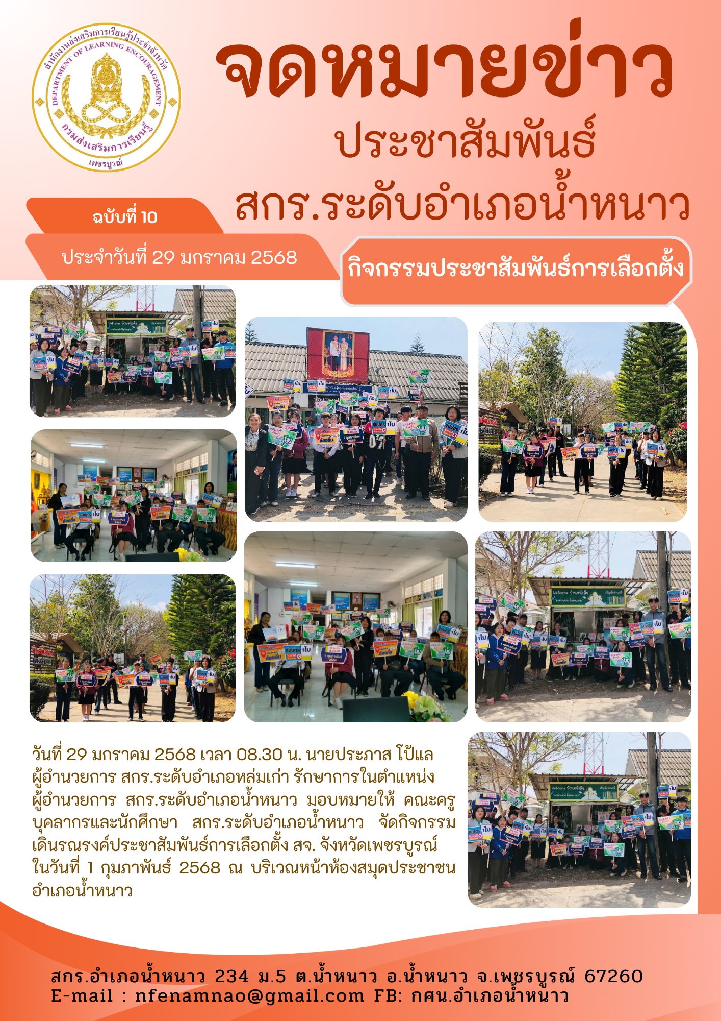 ผู้อำนวยการ สกร.ระดับอำเภอน้ำหนาว มอบหมายให้ คณะครูบุคลากรและนักศึกษา สกร.ระดับอำเภอน้ำหนาว จัดกิจกรรมเดินรณรงค์ประชาสัมพันธ์การเลือกตั้ง สจ. จังหวัดเพชรบูรณ์ในวันที่ 1 กุมภาพันธ์ 2568 ณ บริเวณหน้าห้องสมุดประชาชนอำเภอน้ำหนาว