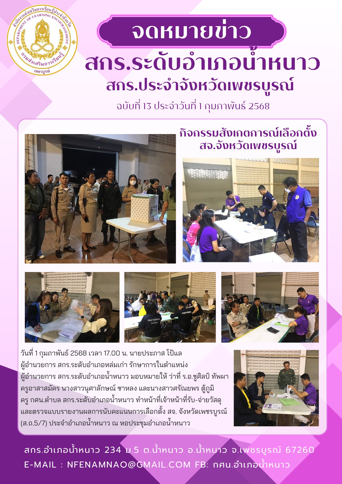 ผู้อำนวยการ สกร.ระดับอำเภอน้ำหนาว มอบหมายให้ ว่าที่ ร.อ.ชูศิลป์ ทัพผา ครูอาสาสมัคร นางสาวนุศาลักษณ์ ซาหลง และนางสาวศรัณยพร ตู้ภูมิครู กศน.ตำบล สกร.ระดับอำเภอน้ำหนาว ทำหน้าที่เจ้าหน้าที่รับ-จ่ายวัสดุ และตรวจแบบรายงานผลการนับคะแนนการเลือกตั้ง สจ. จังหวัดเพชรบูรณ์ (ส.ถ.5/7) ประจำอำเภอน้ำหนาว ณ หอประชุมอำเภอน้ำหนาว