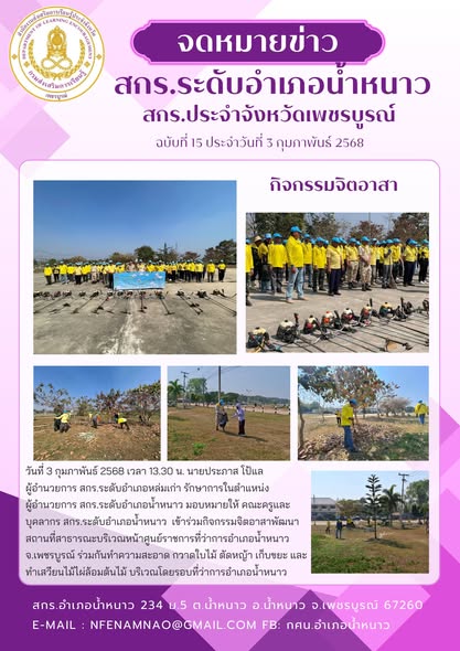 ผู้อำนวยการ สกร.ระดับอำเภอน้ำหนาว มอบหมายให้ คณะครูและบุคลากร สกร.ระดับอำเภอน้ำหนาว เข้าร่วมกิจกรรมจิตอาสาพัฒนา สถานที่สาธารณะบริเวณหน้าศูนย์ราชการที่ว่าการอำเภอน้ำหนาว จ.เพชรบูรณ์ ร่วมกันทำความสะอาด กวาดใบไม้ ตัดหญ้า เก็บขยะ และทำเสวียนไม้ไผ่ล้อมต้นไม้ บริเวณโดยรอบที่ว่าการอำเภอน้ำหนาว
