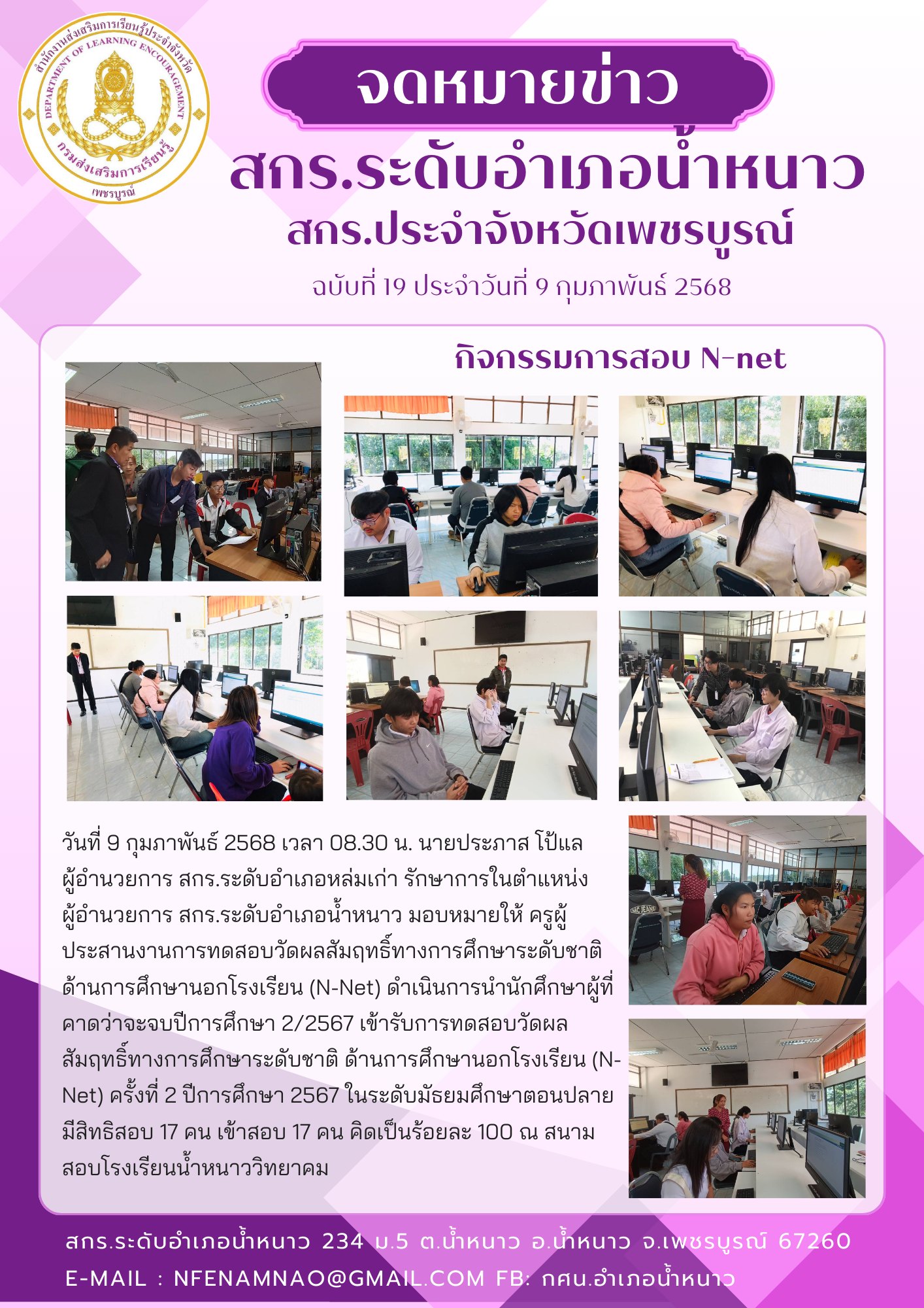 วันที่ 8 กุมภาพันธ์ 2568 เวลา 08.30 น. นายประภาส โป้แล ผู้อำนวยการ สกร.ระดับอำเภอหล่มเก่า รักษาการในตำแหน่งผู้อำนวยการ สกร.ระดับอำเภอน้ำหนาว มอบหมายให้ ครูผู้ประสานงานการทดสอบวัดผลสัมฤทธิ์ทางการศึกษาระดับชาติ ด้านการศึกษานอกโรงเรียน (N-Net) ดำเนินการนำนักศึกษาผู้ที่คาดว่าจะจบปีการศึกษา 2/2567 เข้ารับการทดสอบวัดผลสัมฤทธิ์ทางการศึกษาระดับชาติ ด้านการศึกษานอกโรงเรียน (N-Net) ในระดับประถมศึกษามีสิทธิสอบ 2 คน เข้าสอบ 2 คน คิดเป็นร้อยละ 100 และมัธยมศึกษาตอนต้นมีสิทธิสอบ 10 คน เข้าสอบ 9 คน คิดเป็นร้อยละ 100 ณ สนามสอบโรงเรียนน้ำหนาววิทยาคม โดยมี นางสาวนัทธมน สกุลมรรคา รองผู้อำนวยการสำนักงานส่งเสริมการเรียนรู้ประจำจังหวัดเพชรบูรณ์และคณะนิเทศติดตามผล ลงพื้นที่นิเทศ ติดตาม การทดสอบทางการศึกษาระดับชาติด้านการศึกษานอกระบบโรงเรียน