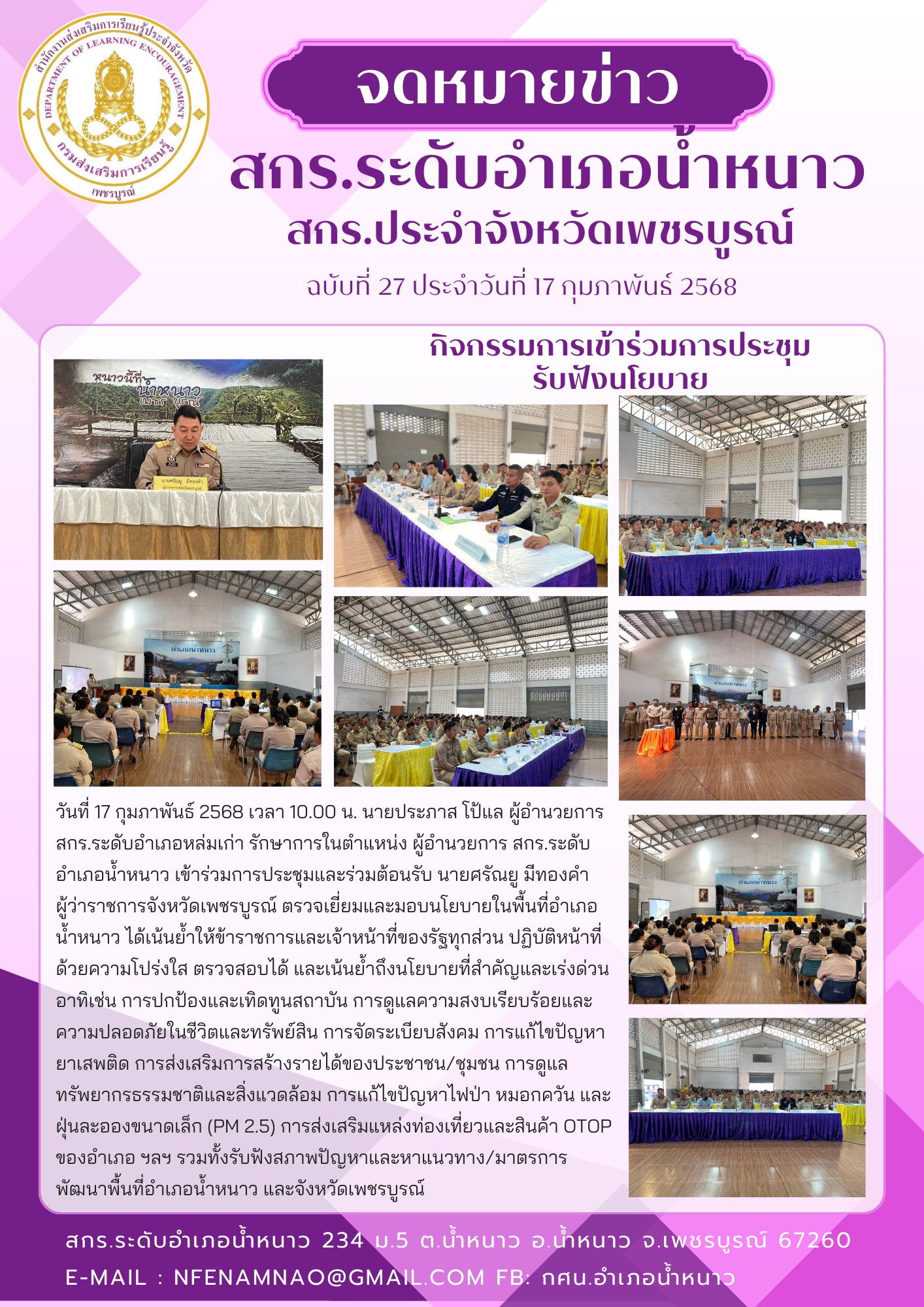 ผู้ว่าราชการจังหวัดเพชรบูรณ์ ตรวจเยี่ยมและมอบนโยบายในพื้นที่อำเภอน้ำหนาว ได้เน้นย้ำให้ข้าราชการและเจ้าหน้าที่ของรัฐทุกส่วน ปฏิบัติหน้าที่ด้วยความโปร่งใส ตรวจสอบได้ และเน้นย้ำถึงนโยบายที่สำคัญและเร่งด่วน อาทิเช่น การปกป้องและเทิดทูนสถาบัน การดูแลความสงบเรียบร้อยและความปลอดภัยในชีวิตและทรัพย์สิน การจัดระเบียบสังคม การแก้ไขปัญหายาเสพติด การส่งเสริมการสร้างรายได้ของประชาชน/ชุมชน การดูแลทรัพยากรธรรมชาติและสิ่งแวดล้อม การแก้ไขปัญหาไฟป่า หมอกควัน และฝุ่นละอองขนาดเล็ก (PM 2.5) การส่งเสริมแหล่งท่องเที่ยวและสินค้า OTOP ของอำเภอ ฯลฯ รวมทั้งรับฟังสภาพปัญหาและหาแนวทาง/มาตรการ พัฒนาพื้นที่อำเภอน้ำหนาว และจังหวัดเพชรบูรณ์ ณ หอประชุมอำเภอน้ำหนาว