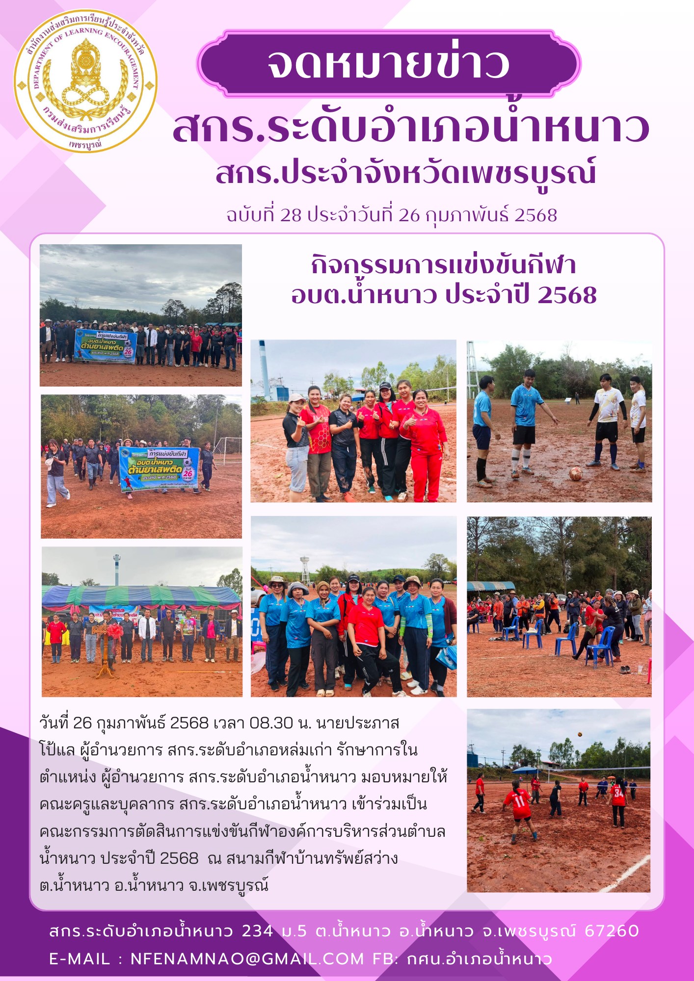 วันที่ 26 กุมภาพันธ์ 2568 เวลา 08.30 น. นายประภาสโป้แล ผู้อำนวยการ สกร.ระดับอำเภอหล่มเก่า รักษาการในตำแหน่ง ผู้อำนวยการ สกร.ระดับอำเภอน้ำหนาว มอบหมายให้ คณะครูและบุคลากร สกร.ระดับอำเภอน้ำหนาว เข้าร่วมเป็นคณะกรรมการตัดสินการแข่งขันกีฬาองค์การบริหารส่วนตำบลน้ำหนาว ประจำปี 2568 ณ สนามกีฬาบ้านทรัพย์สว่าง ต.น้ำหนาว อ.น้ำหนาว จ.เพชรบูรณ์